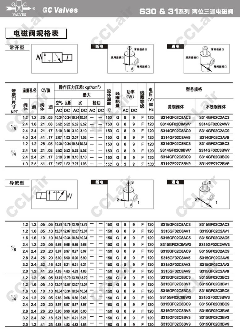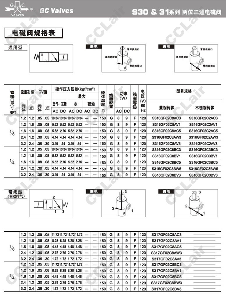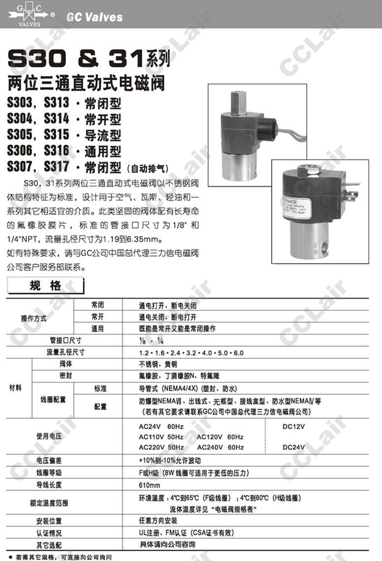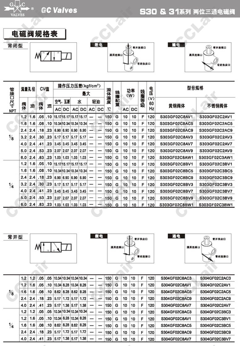 S303GF02,S304GF02,S305GF02,S306GF02,S307GF02,S313GF02,S314GF02,S315GF02,S316GF02,S317GF02,GC Valves二位三通直動式電磁閥
