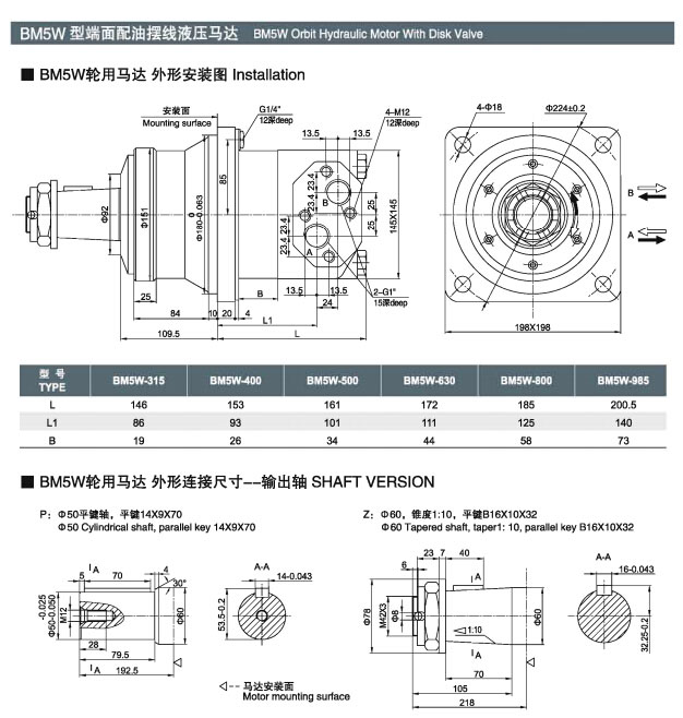 BM5W-315,BM5W-400,BM5W-500,BM5W-630,BM5W-800,BM5W-985,擺線液壓馬達