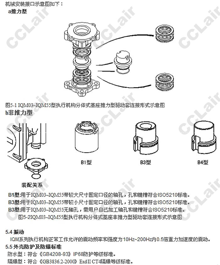 圖5-1、圖5-2。執(zhí)行機(jī)構(gòu)的安裝見圖5-3、圖5-4。在IQM03~IQM55型號中,由于對推力型驅(qū)動部件的改進(jìn),已不再區(qū)分A型與Z型,統(tǒng)