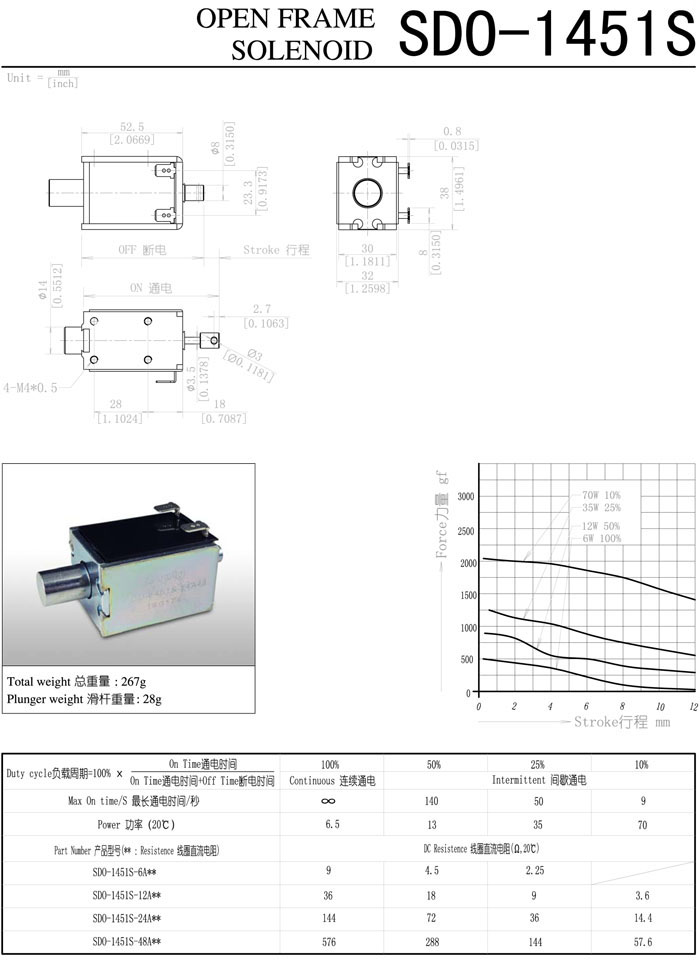 SDO-1451S-6A,SDO-1451S-12A,SDO-1451S-24A,SDO-1451S-48A,直動電磁鐵