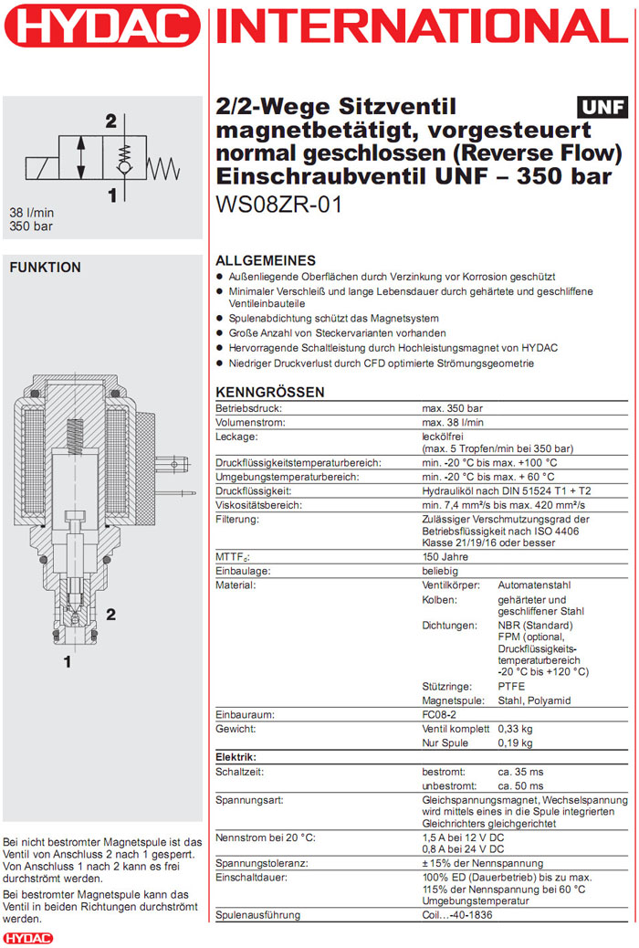 WS08ZR-01-C-N-12DG,WS08ZR-01-C-N-24DG,WS08ZR-01-C-N-230AG,HYDAC電磁2/2方向座閥