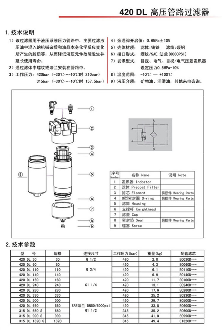 420DL30,420DL60,420DL110,420DL140,420DL160,420DL240,420DL280,420DL30KN3,單筒高壓管路過濾器 |