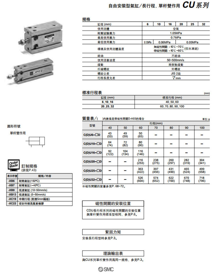 CU6,CU10,CU16,CU20,CU25,CU32,CDU6,CDU10,CDU16,CDU20,CDU25,CDU32,CU6-40D,SMC自由安裝型氣缸