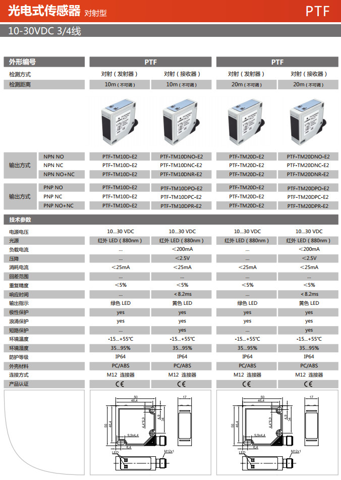 PTF-TM10D-E2,PTF-TM10DNO-E2,PTF-TM10DNC-E2,PTF-TM20D-E2,PTF-TM20DNO-E2,PTF-TM20DNC-E2,光電式傳感器
