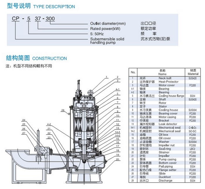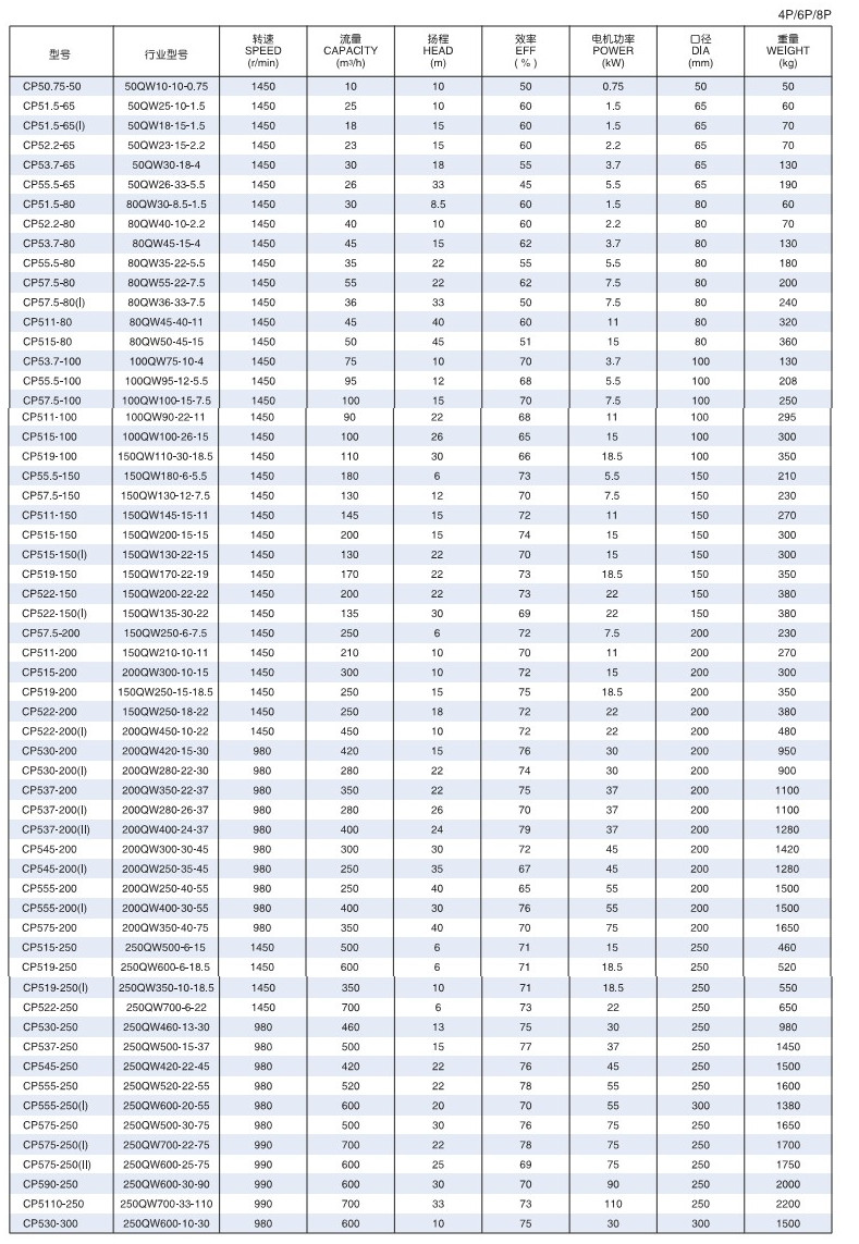 CP50.75-50,CP51.5-50,CP52.2-50,CP53.7-50,CP55.5-50,CP53.7-65,CP55.5-65,CP57.5-65,沉水式污物(泥)泵