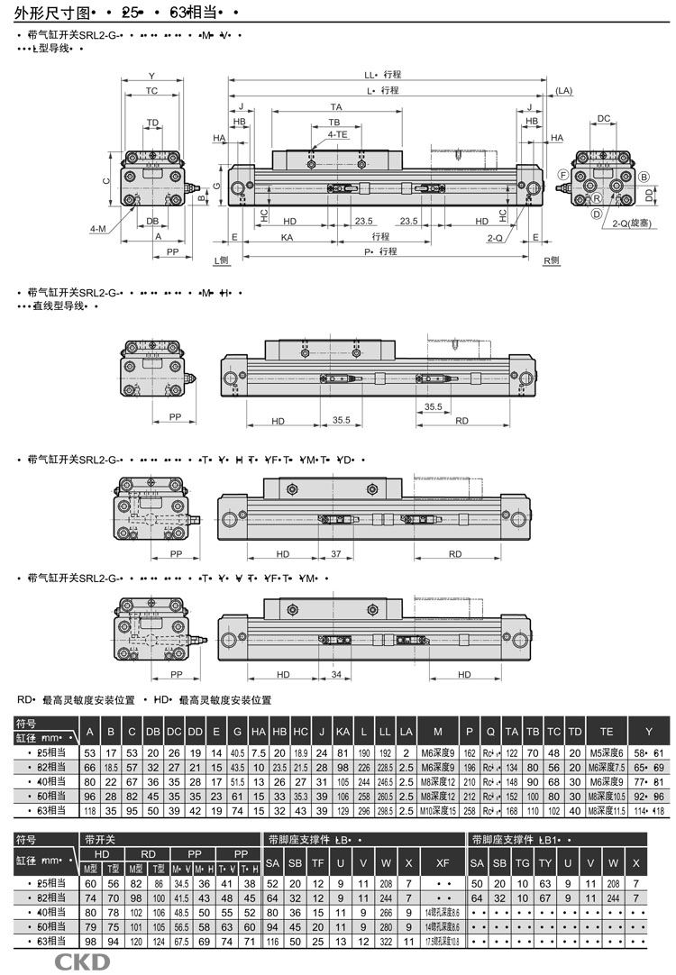 SRL2-G-LB1-25B-200,SRL2-G-LB1-25B-300,SRL2-G-LB1-25B-400,SRL2-G-LB1-25B-500,SRL2-G-LB1-25B-600,CKD超級無活塞桿型氣缸