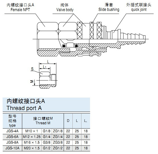 型號規(guī)格說明,下圖例JGS-W-6A(JGS-K-6B)插入式外螺紋接口。高性能快速接頭,外插式內(nèi)螺紋接口。