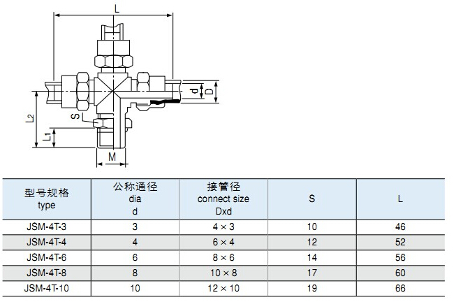 JSM-4T-3,JSM-4T-4,JSM-4T-6,JSM-4T-8,JSM-4T-10,鎖母式四通管接頭