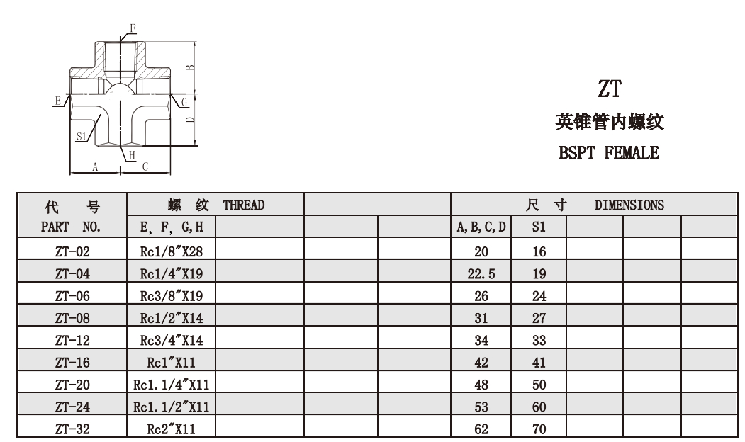 ZT-02,ZT-04,ZT-06,ZT-08,ZT-12,ZT-16,ZT-20,ZT-24,ZT-32,英錐管內螺紋接頭
