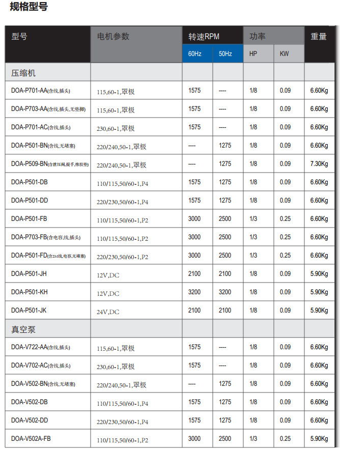 DOA-P701-AA,DOA-P703-AA,DOA-V722-AA,DOA-V702-AC,隔膜式真空泵/壓縮機