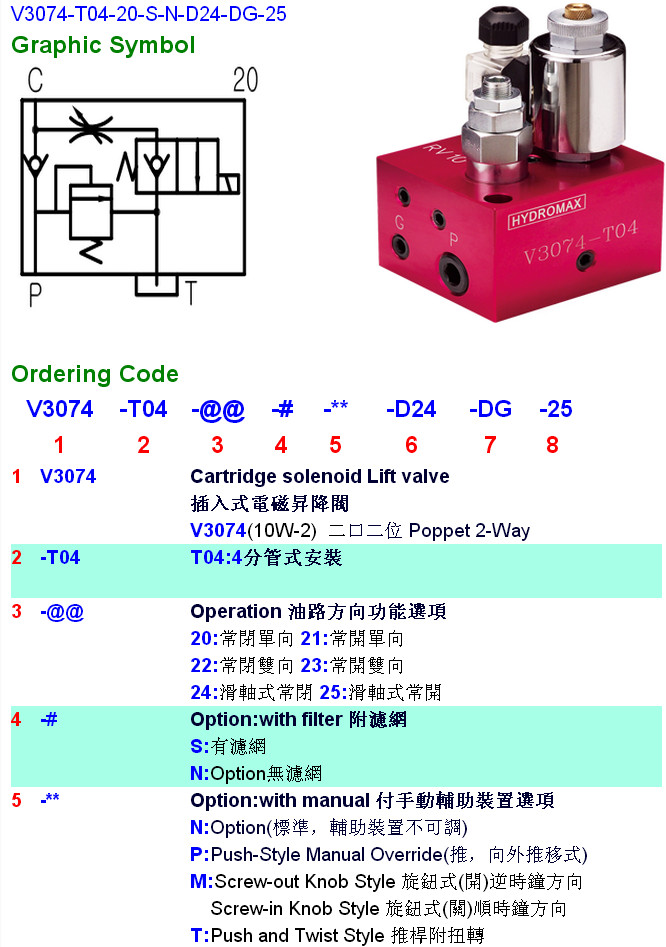 V3074-T04-21,V3074-T04-22,V3074-T04-23,V3074-T04-24,V3074-T04-20-S-N-D24-DG-25,HYDROMAX插入式電磁升降閥