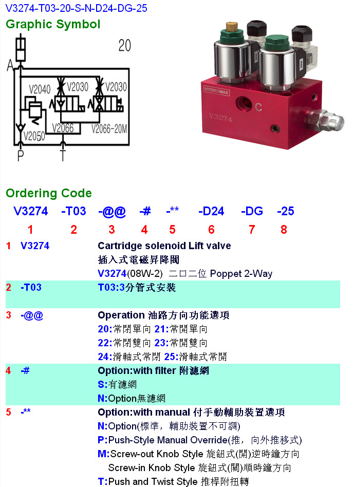 V3274-T03-21,V3274-T03-22,V3274-T03-23,V3274-T03-24,V3274-T03-20-S-N-D24-DG-25,HYDROMAX插入式電磁升降閥
