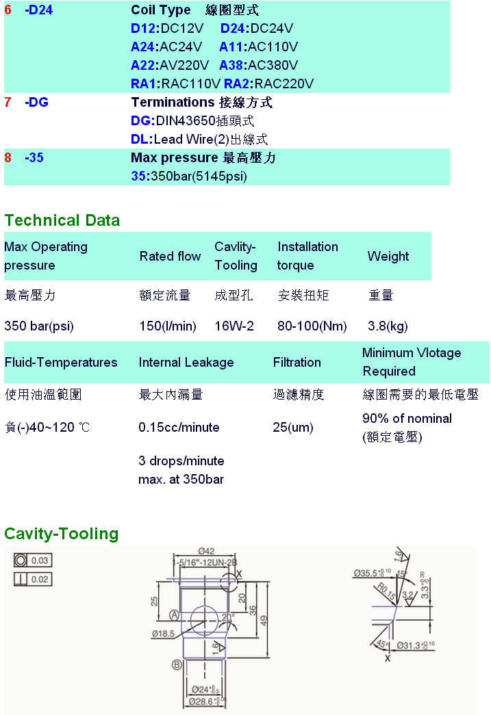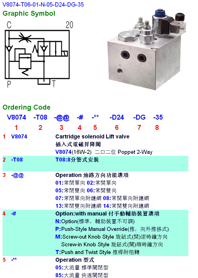 V8074-T06-02,V8074-T06-05,V8074-T06-06,V8074-T06-07,V8074-T06-01-N-05-D24-DG-35,HYDROMAX插入式電磁升降閥 |
