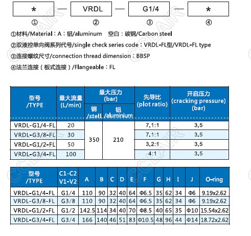 VRDL-G1/4-FL,VRDL-G3/8-FL,VRDL-G1/2-FL,VRDL-G3/4-FL,VRDL-FL,雙向液壓鎖(板式連接) |