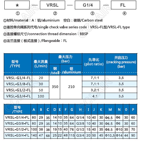 VRSL-G1/4-FL,VRSL-G3/8-FL,VRSL-G1/2-FL,VRSL-G3/4-FL,VRSL-FL,單向液壓鎖(板式連接)