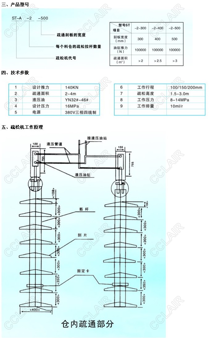 隨著國內(nèi)火力發(fā)電站不斷向大型化和自動(dòng)化控制發(fā)展,原煤斗尺寸不斷加大,同時(shí),由于直吹式磨煤機(jī)的廣泛應(yīng)用,磨煤機(jī)對給煤機(jī)平穩(wěn)供煤的要求提高等因素。我廠自主研發(fā)了新一代全自動(dòng)液壓清堵裝置ST-A系列煤倉疏松機(jī)。是利用液壓泵站帶動(dòng)液壓油缸拖動(dòng)料倉內(nèi)刮板上下移動(dòng)工作,達(dá)到疏松物料的目的。該產(chǎn)品根據(jù)斷煤信號的傳輸進(jìn)行自動(dòng)啟動(dòng)關(guān)閉及時(shí)疏通物料,在10秒內(nèi)恢復(fù)料倉內(nèi)物料流動(dòng),料倉恢復(fù)后自動(dòng)停止。