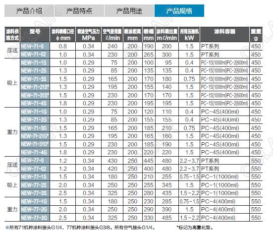 NEW-71-0,NEW-71-3S,NEW-71-31G,NEW-77-2G,NEW-77-3G,NEW-71/77小型、中型噴槍