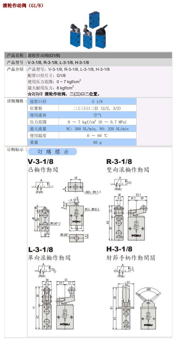 V-3-1/8,R-3-1/8,L-3-1/8,H-3-1/8,PST滾輪作動閥