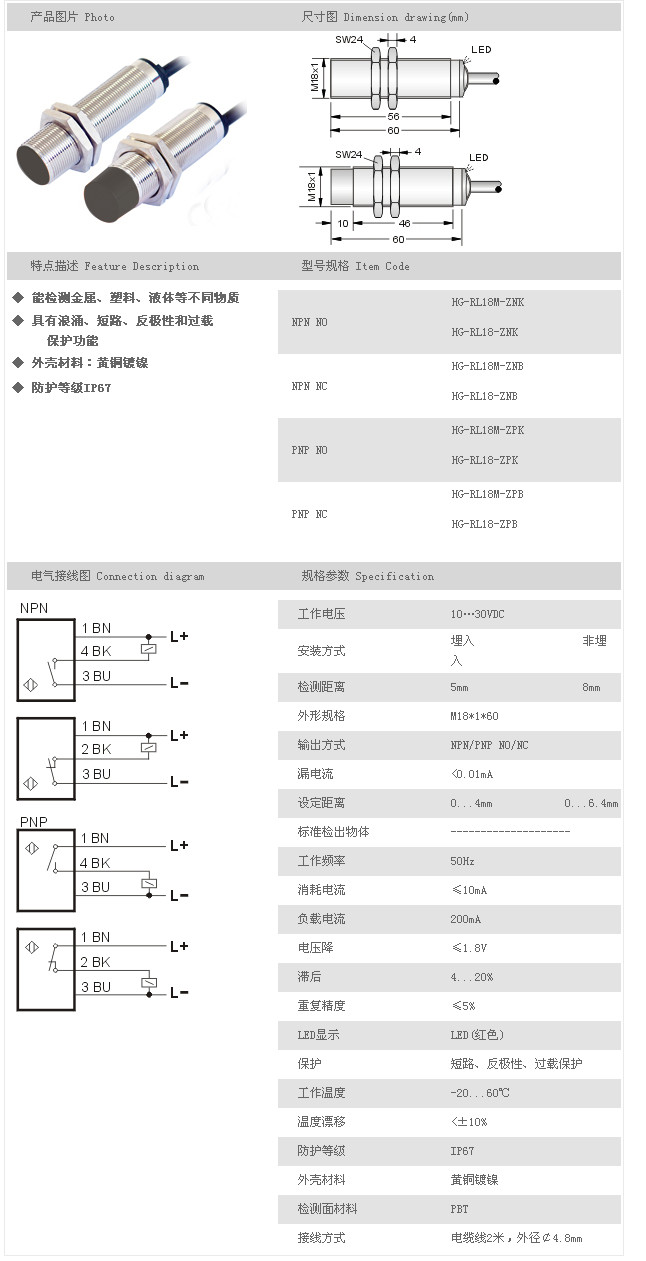 電容式接近傳感器 HG-RL18M-ZNK,HG-RL18-ZNK,HG-RL18M-ZNB,HG-RL18-ZNB,HG-RL18M-ZPK,HG-RL18-ZPK,HG-RL18M-ZPB,HG-RL18-ZPB,
