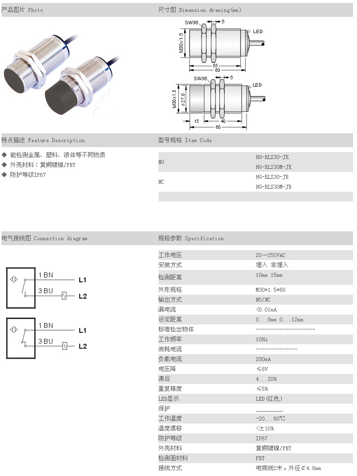 電容式接近傳感器 HG-RLS30-JK,HG-RLS30M-JK,HG-RLS30-JB,HG-RLS30M-JB,