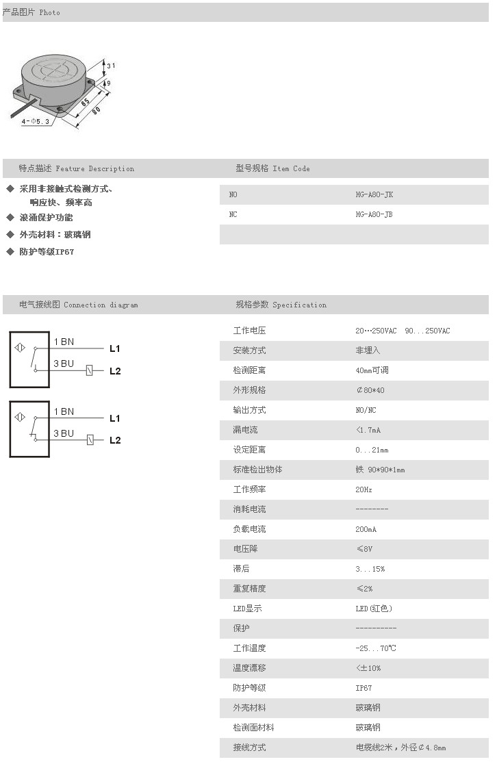 餅型接近傳感器 HG-A80-JK,HG-A80-JB,