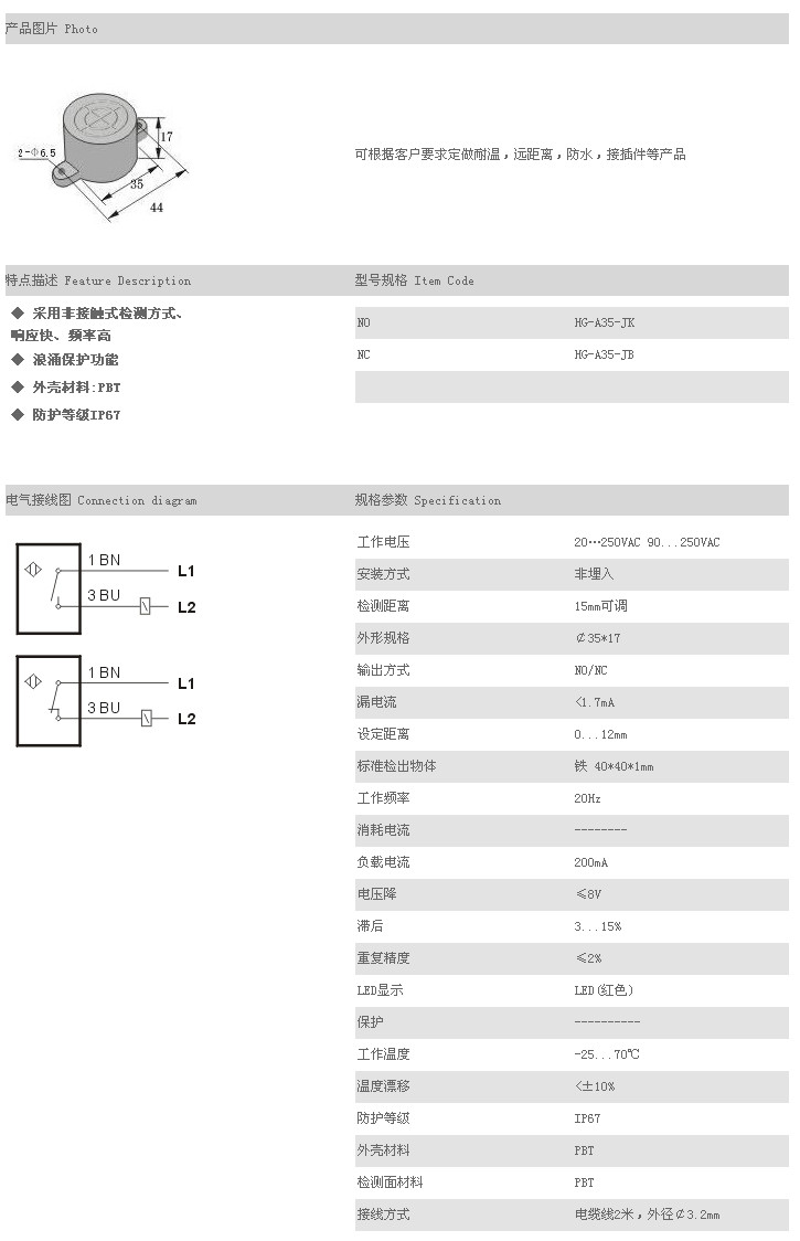 餅型接近傳感器 HG-A35-JK,HG-A35-JB,