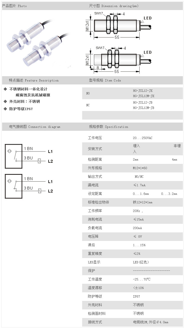 金屬探頭型接近開關(guān) HG-JSL12-JK,HG-JSL12M-JK,HG-JSL12-JB,HG-JSL12M-JB,