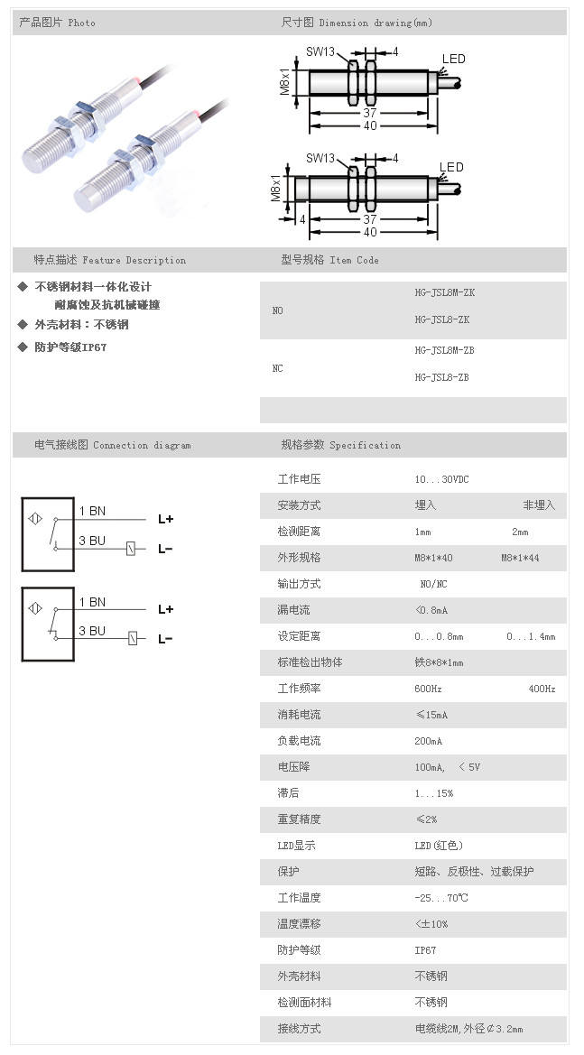 金屬探頭型接近開(kāi)關(guān) HG-JSL8M-ZK,HG-JSL8-ZK,HG-JSL8M-ZB,HG-JSL8-ZB,