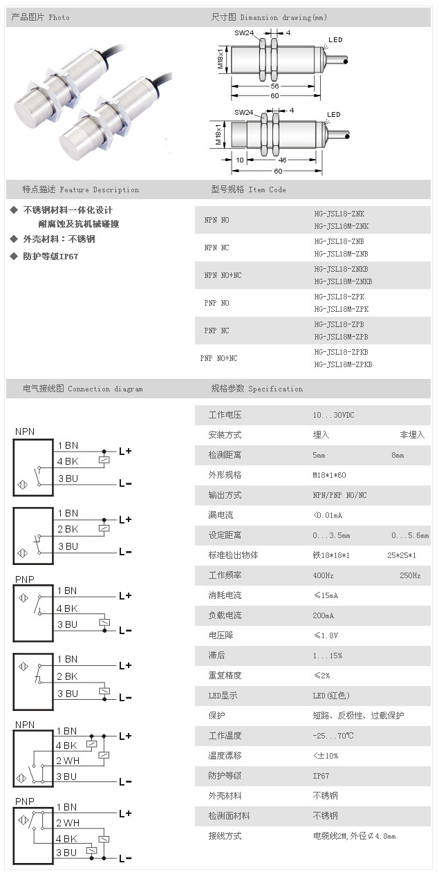 金屬探頭型接近開關(guān) HG-JSL18-ZNK,HG-JSL18M-ZNK,HG-JSL18-ZNB,HG-JSL18M-ZNB,