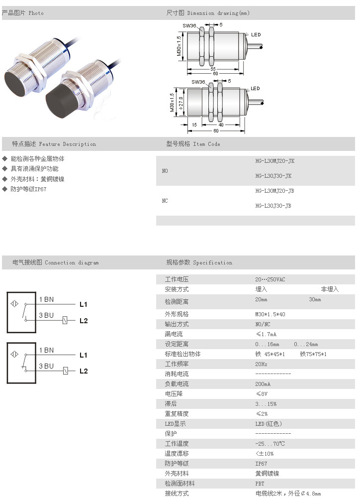 遠距離型接近開關(guān) HG-L30MJ20-JK,HG-L30J30-JK,HG-L30MJ20-JB,HG-L30J30-JB,