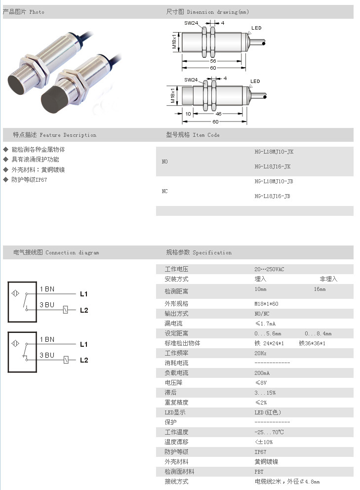遠距離型接近開關(guān) HG-L18MJ10-JK,HG-L18J16-JK,HG-L18MJ10-JB,HG-L18J16-JB,