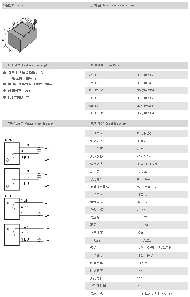 J40方型接近開關 HG-J40-ZNK,HG-J40-ZNB,HG-J40-ZNKB,HG-J40-ZPK,HG-J40-ZPB,HG-J40-ZPKB,