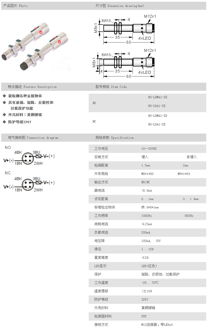 圓柱型接近開關(guān) HG-L8MA1-ZK,HG-L8A1-ZK,HG-L8MA1-ZB,HG-L8A1-ZB,