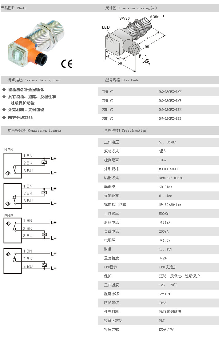 L30MZ圓柱型接近開關(guān) HG-L30MZ-ZNK,HG-L30MZ-ZNB,HG-L30MZ-ZPK,HG-L30MZ-ZPB,