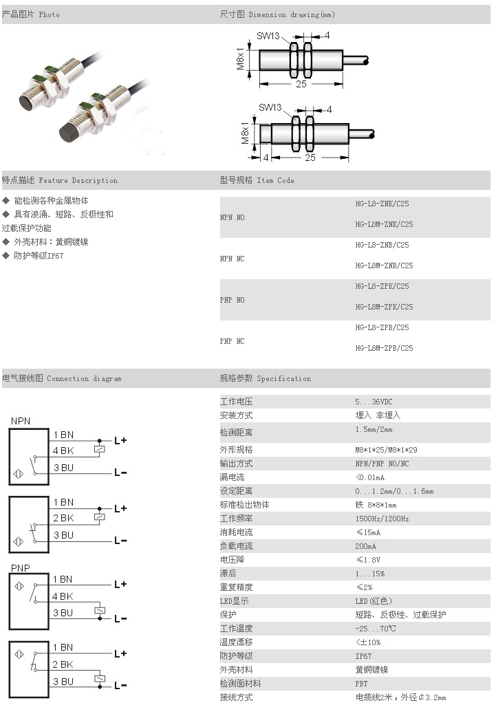 L8短圓柱型接近開關(guān) HG-L8-ZNK/C25,HG-L8M-ZNK/C25,HG-L8-ZNB/C25,HG-L8M-ZNB/C25,