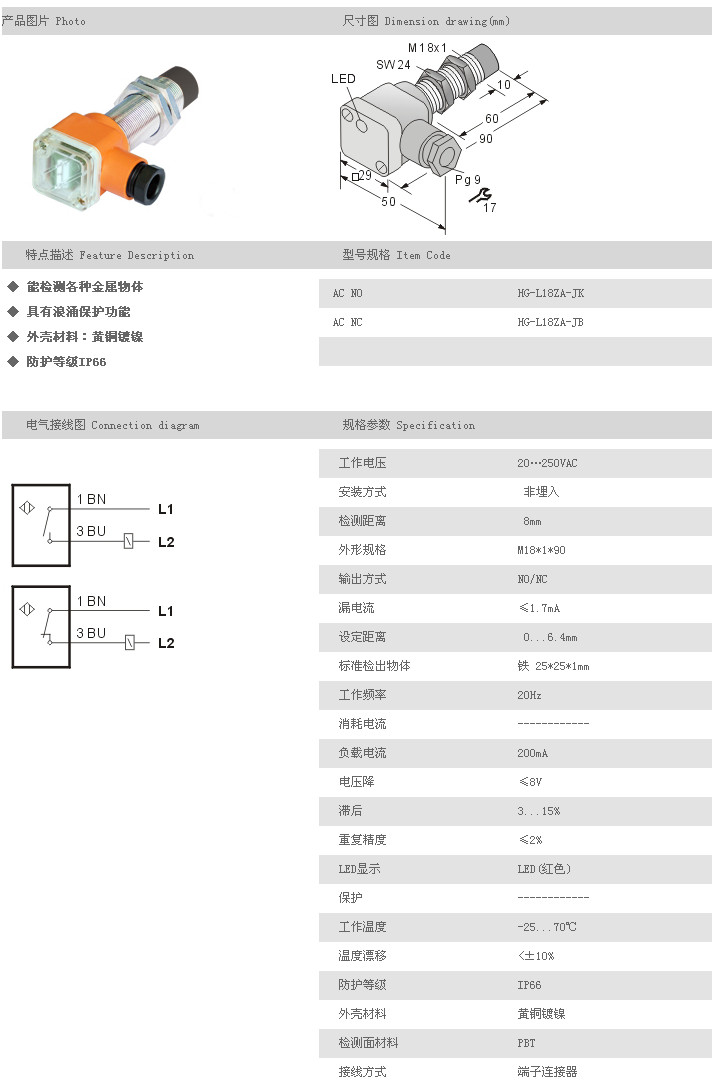 L18ZA圓柱型接近開關(guān) HG-L18ZA-JK,HG-L18ZA-JB,