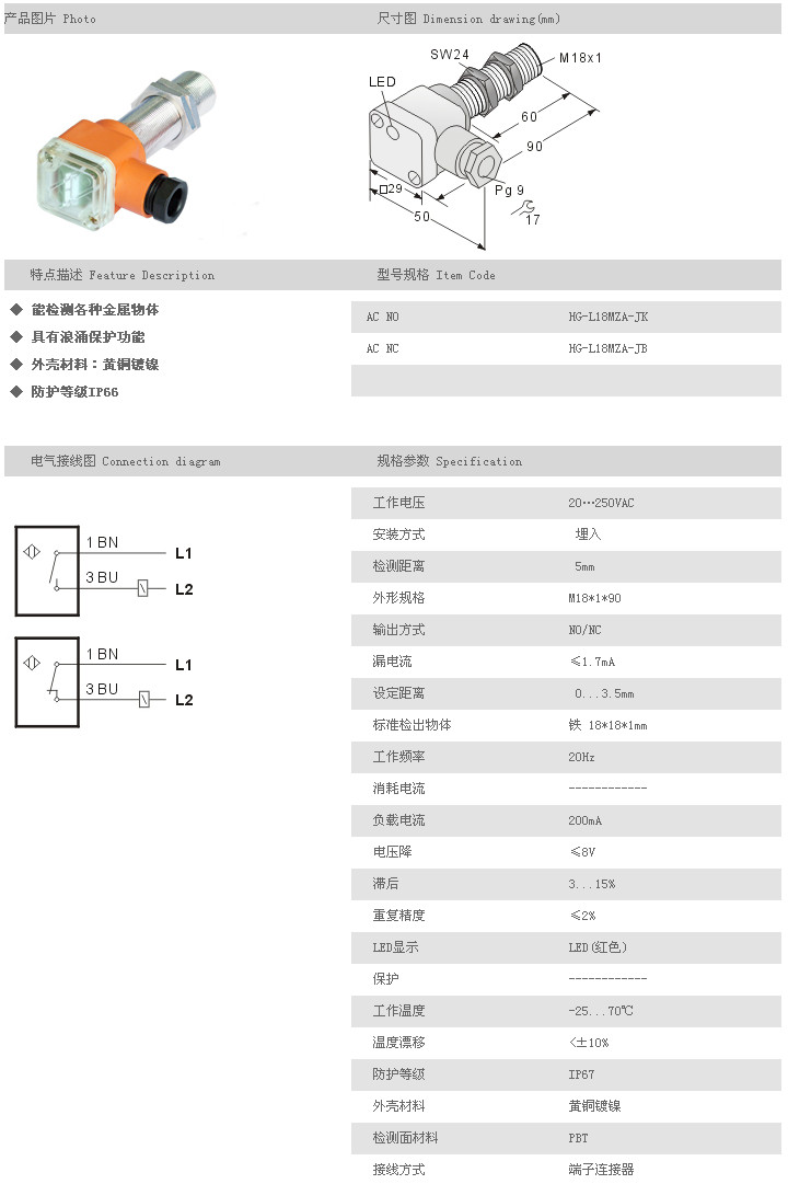 L18MZA圓柱型接近開關(guān) HG-L18MZA-JK,HG-L18MZA-JB,
