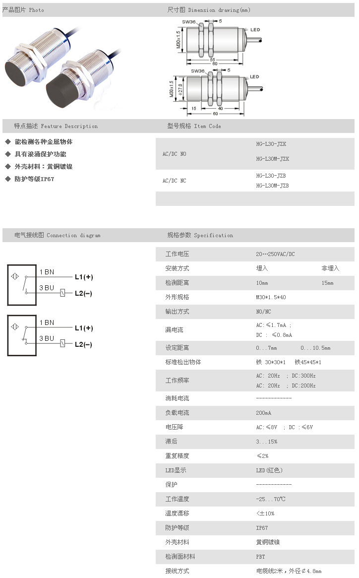 L30圓柱型接近開關 HG-L30-JZK,HG-L30M-JZK,HG-L30-JZB,HG-L30M-JZB,