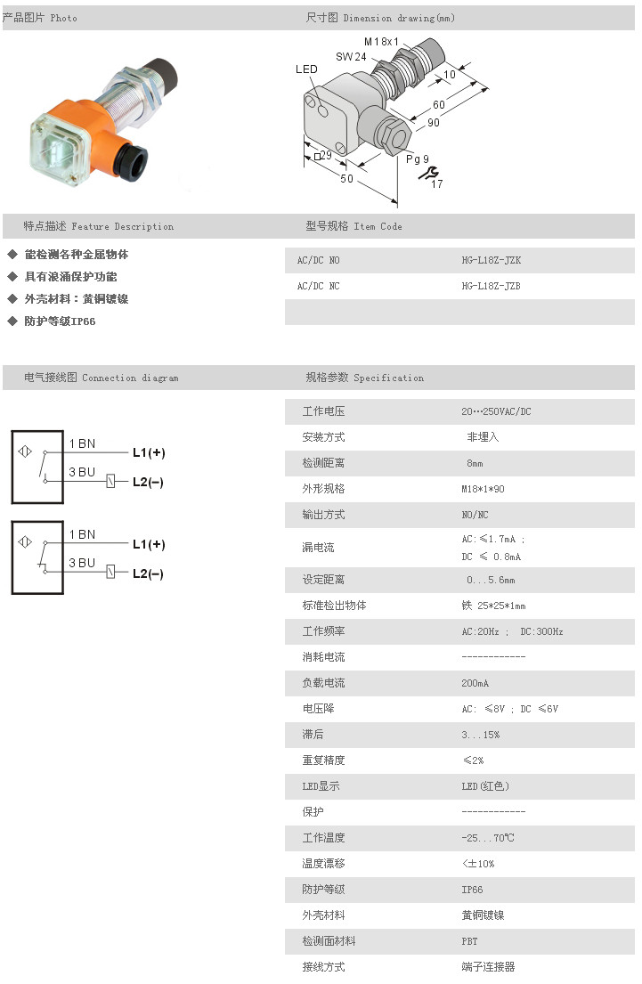 L18Z圓柱型接近開(kāi)關(guān) HG-L18Z-JZK,HG-L18Z-JZB,