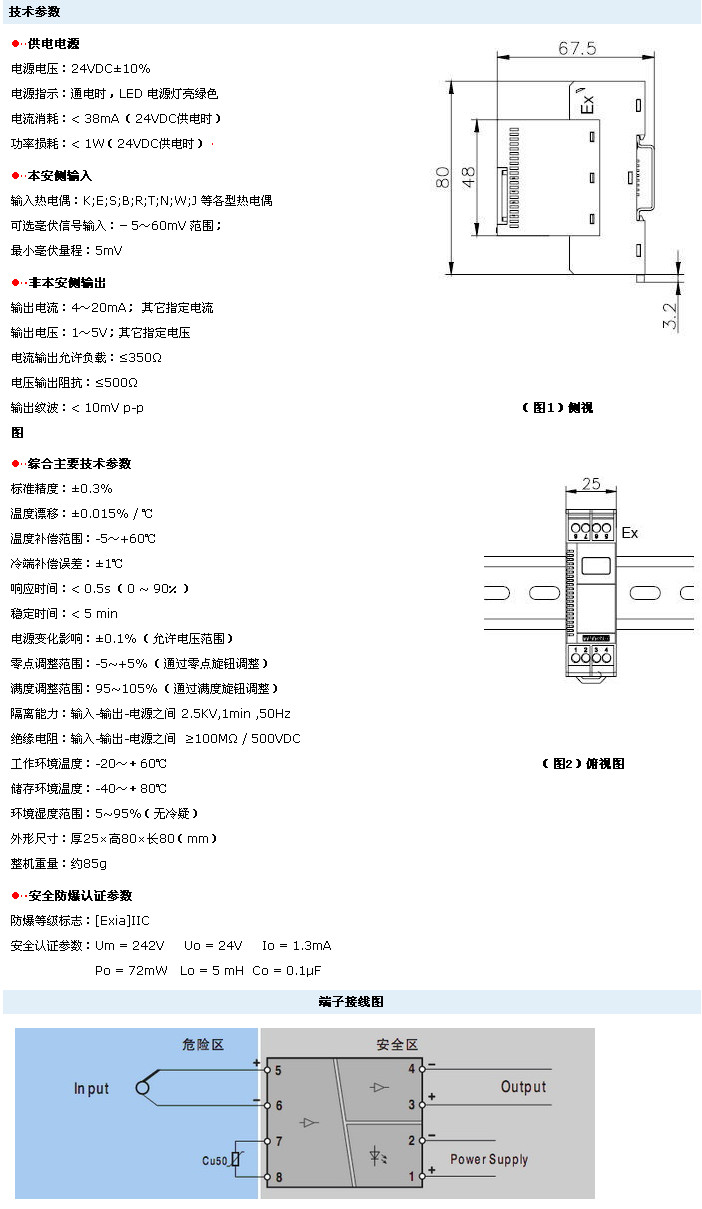 接收現(xiàn)場(chǎng)危險(xiǎn)區(qū)域的熱電偶信號(hào)或其它毫伏信號(hào),經(jīng)過(guò)隔離和線性化處理,轉(zhuǎn)換為線性化的直流信號(hào)輸出至安全區(qū)的控制系統(tǒng)或其它單元組合儀表。輸出信號(hào)(420mA ,15V)與溫度成線性關(guān)系經(jīng)。