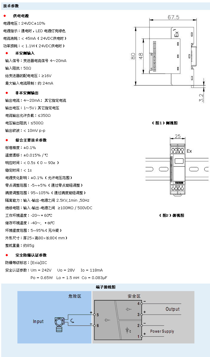 給處于現(xiàn)場危險區(qū)域的二線制變送器提供隔離的直流電源并檢測來自變送器的4~20mA電流信號,  經(jīng)過隔離、抗干擾抑制等處理后,向安全側(cè)的控制系統(tǒng)或其它單元組合儀表輸出直流電流或電壓信號。