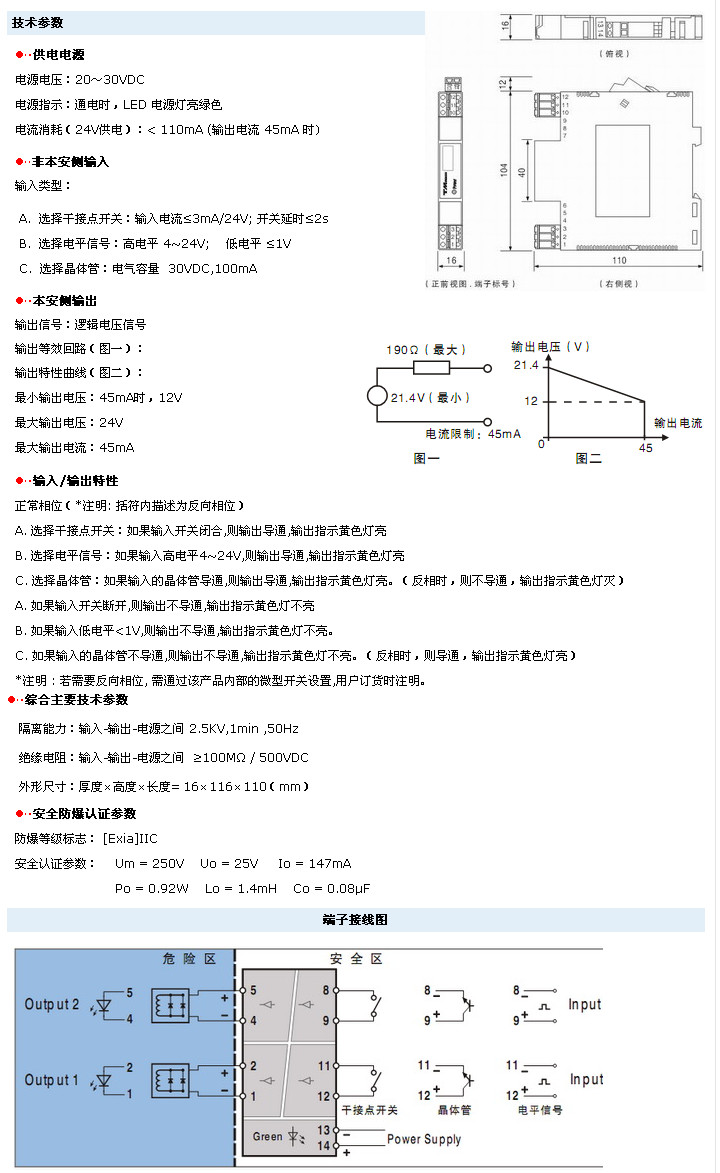 開(kāi)關(guān)量輸出隔離安全柵(二入二出):輸出電源信號(hào)至危險(xiǎn)區(qū)