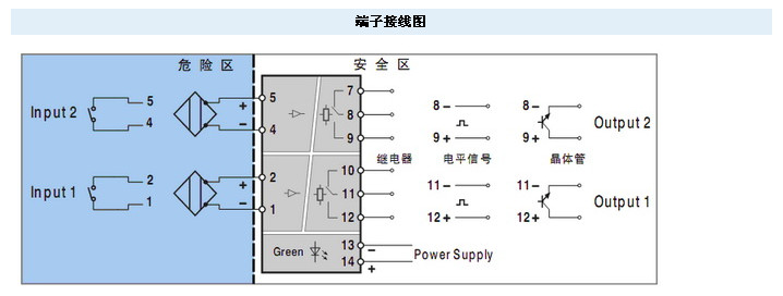 接收來(lái)自危險(xiǎn)區(qū)域的開(kāi)關(guān)或接近開(kāi)關(guān)信號(hào),通過(guò)安全柵隔離,以繼電器觸點(diǎn)(電平信號(hào)或晶體管)輸出方式傳送至安全區(qū)的控制系統(tǒng)或其它組合儀表。