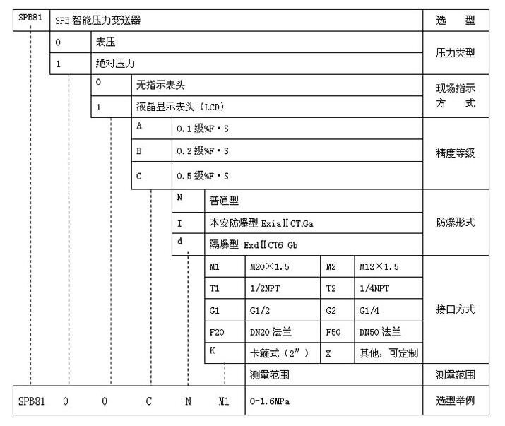 如上選型SPB8100CNM1 0-1.6MPa代表:智能型壓力變送器,不帶表頭顯示,安裝螺紋為M20*1.5,精度0.5級(jí),普通型,量程為0-1.6MPa。