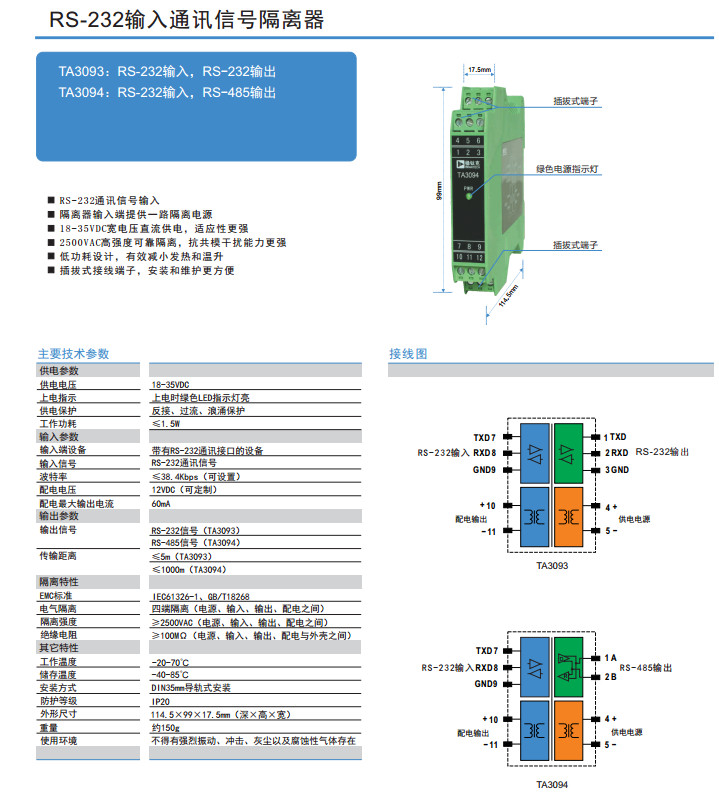 TA3093,TA3094,RS-232輸入通訊信號隔離器