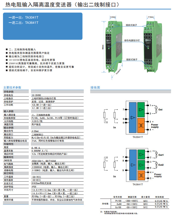 TA3041T,TA3641T,熱電阻輸入隔離溫度變送器(輸出二線制接口)