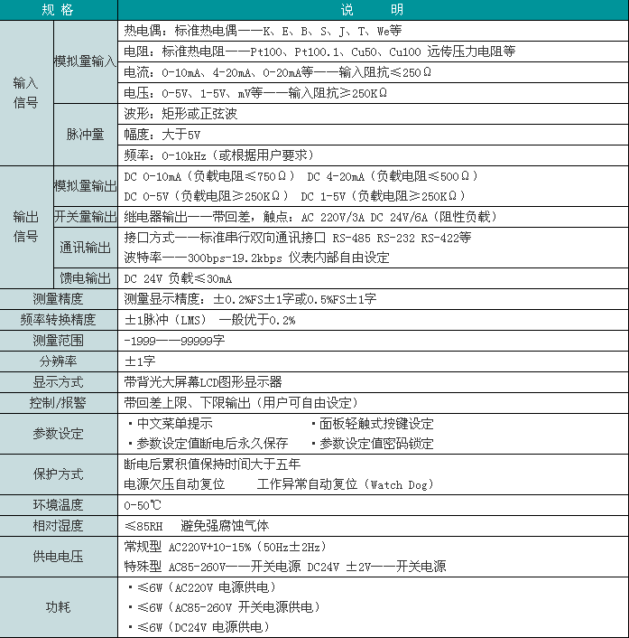 本表所列為最大量程,用戶可在量程范圍內(nèi)通過修改儀表二級參數(shù)確定量程范圍