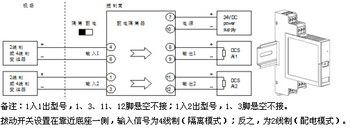 MIK-502E系列信號(hào)隔離器兼容配電(無(wú)源輸入)和隔離(有源輸入)2種模式:配電(無(wú)源輸入)模式,向現(xiàn)場(chǎng)的2線制變送器提供工作電源,采樣變送器輸出的2線制電流信號(hào),經(jīng)過(guò)隔離處理后轉(zhuǎn)換為4線制電流信號(hào)輸出;隔離(有源輸入)模式,采樣4線制電流信號(hào),經(jīng)過(guò)隔離輸出4線制電流信號(hào)。通過(guò)產(chǎn)品上側(cè)內(nèi)置的撥動(dòng)開(kāi)關(guān)可設(shè)置輸入模式。可選1入1出、1入2出、2入2出。