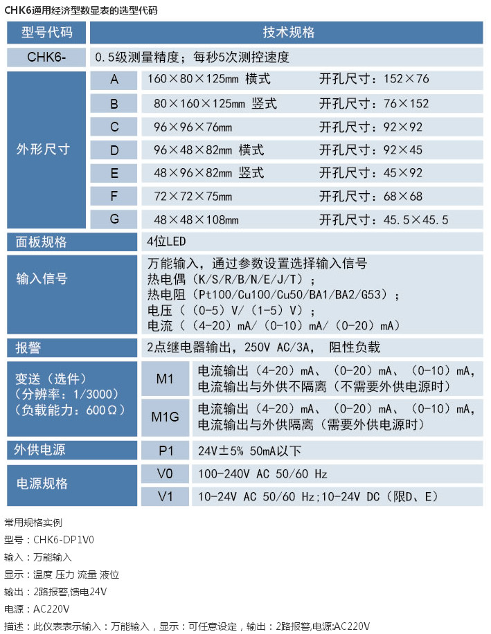CHK6通用經(jīng)濟型數(shù)顯儀表與各類模擬量輸出的傳感器、變送器配合,完成溫度、壓力、液位、成分等物理量的測量、變換、顯示和控制.