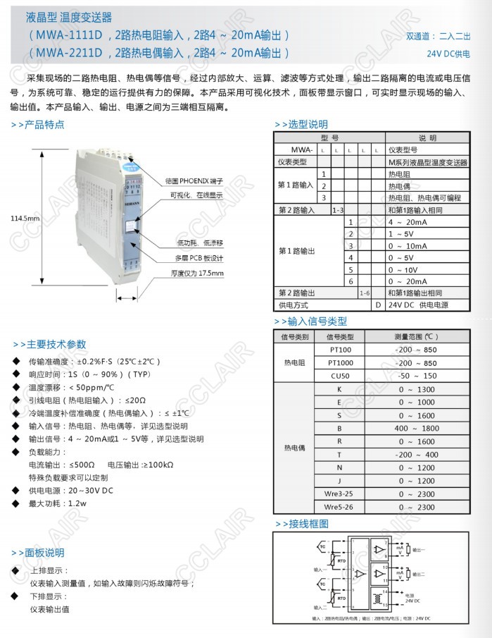 MWA-1111D,MWA-1216D,MWA-1341D,MWA-2166D,MWA-2264D,MWA-3151D,MWA-3365D,溫度變送器
